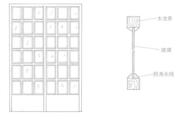 玻璃花饰隔断可将各种艺术玻璃、装饰玻璃安装隔断骨架上(图),首先,根据设计要求,将木龙骨做成造型后,上下左右与墙体固定,龙骨面层再封装饰板,固定玻璃采用钉装木角线的方法。
