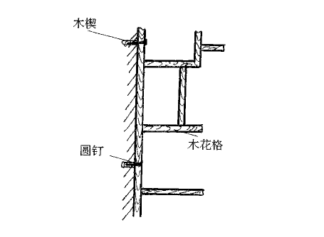按设计要求,在墙面、地面弹线,然后安装已做好的木质框架。不同的材料安装方法虽有所不同,但均可用钻孔安装膨胀螺栓固定或钻孔钉木楔子用圆钉固定(图)。