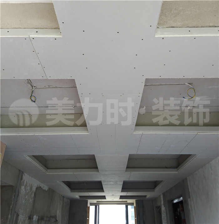 ▲ 该工地正在进行柜子的施工。图为入户区域的吊顶。