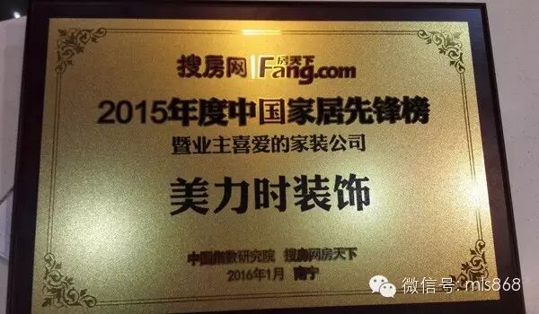 2016年1月17日,中国指数网搜房网房天下举行表彰大会,对业主喜爱的装饰公司及材料门店进行表彰,经过严格考核评选,美力时等装饰公司荣获2015年度中国家居先锋榜暨业主喜爱的家装公司荣誉称号!